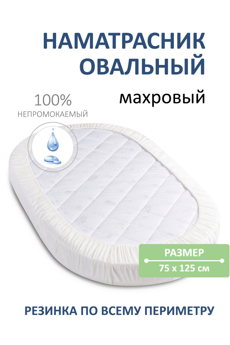Детский овальный наматрасник непромокаемый 75х120 на резинке по всему периметру. Изготовлен из махрового полотна с мембранным покрытием (мулетон Aquastop). Борта шириной 15 см изготовлены из мулетона Aquastop. Водонепроницаемый чехол на матрас защищает матрас от влаги и грязи, а постельное белье на нем не скользит. Для более надежной фиксации мы используем резинку, прошитую усиленным швом. Прост в уходе и быстро сохнет, рекомендуемая температура стирки до 30 градусов. Наматрасник аквастоп 75х120 может быть использован как непромокаемая простынь, его дышащая махровая поверхность приятна к телу и гипоаллергенна. Отлично подходит для детской кроватки.