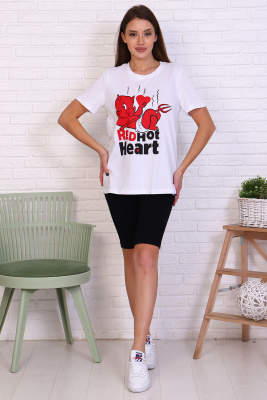 Молодежный костюм футболка и велосипедки. Футболка из кулирки 100% хлопок свободного кроя, стиль oversize, втачным коротким рукавом горловина округлой формы. На полочке изделия принт. Низ рукава и низ изделия подгибка. Велосипедки из кулирки с лайкрой облегающего силуэта без бокового шва. Низ изделия подгибка.